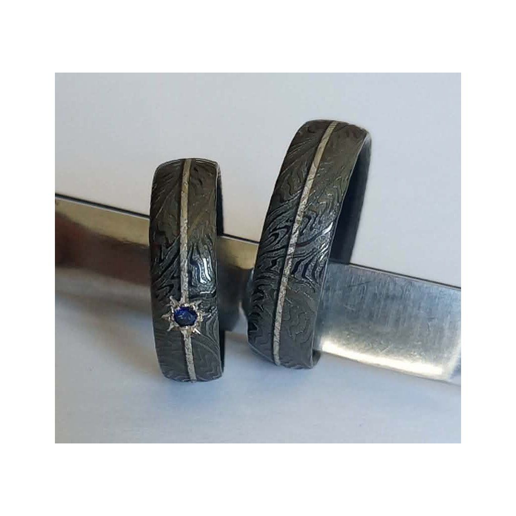 Prsteny černěné se světlou drážkou uprostřed, dámský prsten má modrý kamínek usazený v lůžku z bílého zlata a je ozdoben vyrytou hvězdičkou