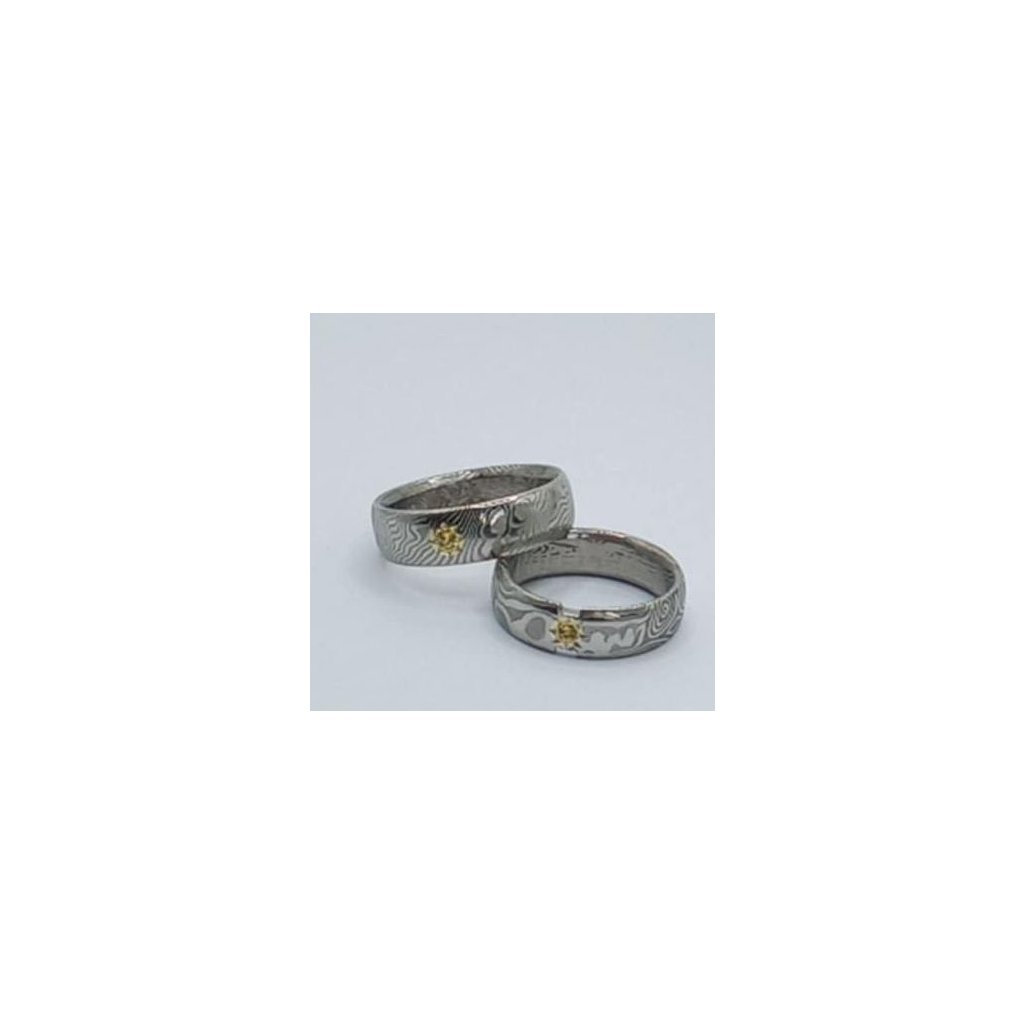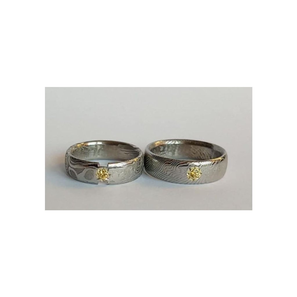 Snubní prsteny se žlutými safíry usazenými ve zlatém lůžku. Kolem kamene jsou vyryty paprsky slunce, čímž se zvýrazní třpyt kamene.